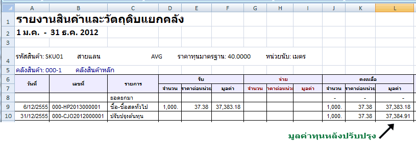 ตัวอย่างรายงานสต็อกการ์ด หลังยืนยันใบปรับปรุงต้นทุน