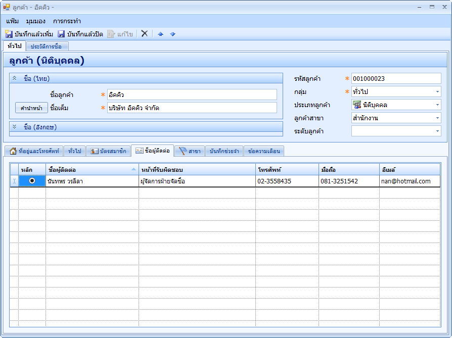 คุณสามารถบันทึกรายชื่อผู้ติดต่อ ได้ไม่จำกัด และในกิจกรรมต่าง ๆ ที่เกี่ยวกับการค้นหาลูกค้า คุณสามารถค้นหาตามชื่อผู้ติดต่อได้