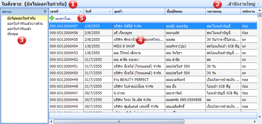 5.แถวการสร้างเอกสารใหม่ โดยการคลิกที่แถวรายการเอกสารที่ปรากฏจะถูกกรองตามสถานะของเอกสารที่เลือกอยู่ในแถบนาวิเกเตอร์ (3) และ สาขาที่เลือก (2) รายการเอกสารที่แสดงนั้นจะแสดงได้คราวละสาขาเท่านั้น ไม่สามารถแสดงรวมสาขาได้ หากต้องการดูรายการเอกสารของสาขาอื่น ๆ ให้คุณคลิกที่ (2) จะมีรายการแบบเลื่อนลงให้คุณเลือกสาขาที่ต้องการ