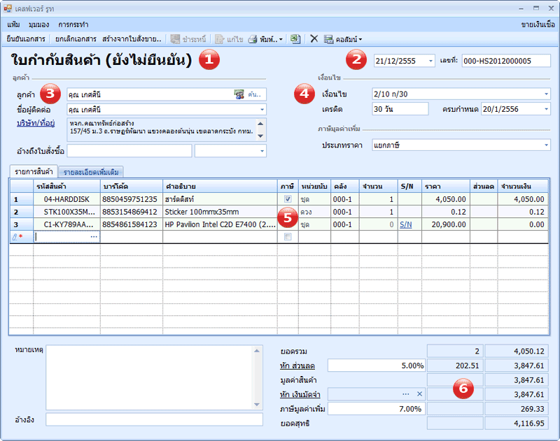 เอกสารที่สร้างขึ้นใหม่ โปรแกรมจะกำหนดวันที่เอกสารเป็นวันที่ปัจจุบันให้ก่อน และเลขที่เอกสารโปรแกรมจะรันนิ่งให้ตามรูปแบบที่คุณกำหนดไว้ในการตั้งค่าแฟ้มเอกสาร รวมถึงการอนุญาติให้แก้ไขเลขที่เอกสารได้หรือไม่นั้นก็เช่นเดียวกัน