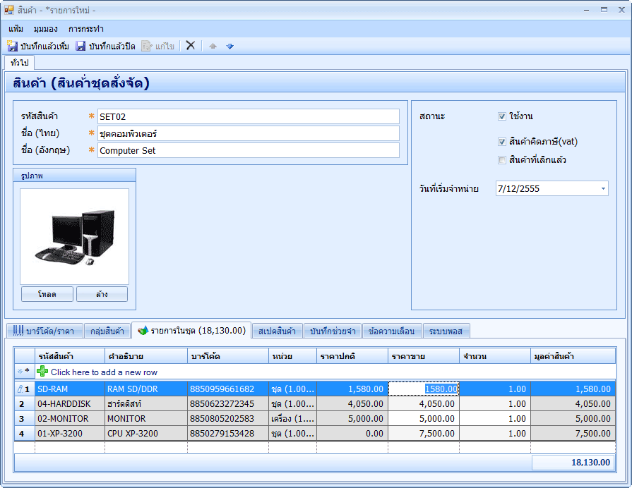 การกำหนดราคาขาย จะกำหนดที่รายการในชุด เป็นราคาที่ลดลงจากราคาสินค้าปกติเมื่อเป็นชุด