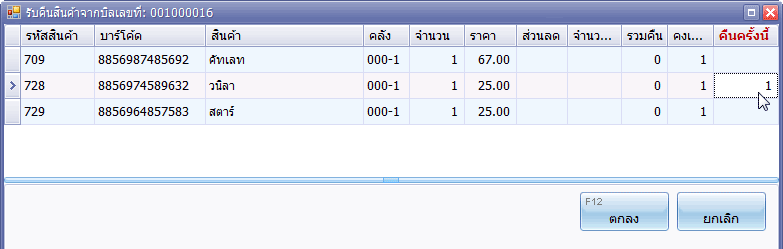 โปรแกรมจะสร้างรายการสินค้าที่คืน จากนั้นให้คุณจบบิลตามปกติ