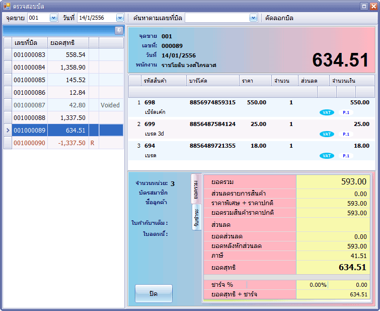 รายการบิลขายทางด้านซ้าย ประกอบด้วยคอลัมน์ เลขที่บิล ยอดสุทธิ ประเภทบิล สถานะ