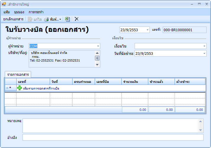 หลังจากเลือกผู้จำหน่ายแล้ว ให้ คลิกที่แถว เพิ่มรายการเอกสารที่วางบิล