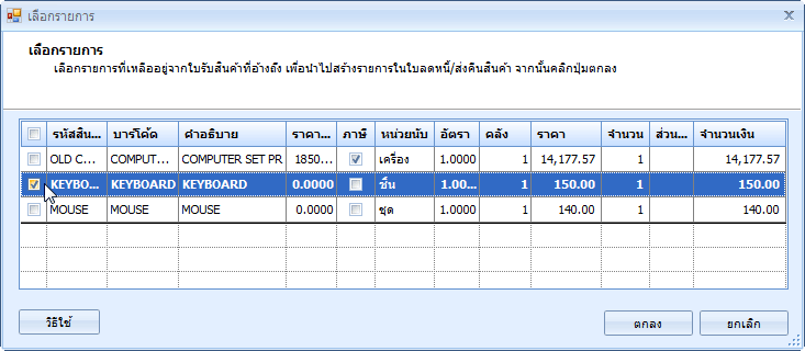 จะปรากฏหน้าต่างให้คุณเลือกรายการสินค้าตามใบรับที่อ้างถึง เพื่อนำมาทำลดหนี้ ให้คุณเช็คถูกหน้ารายการที่ต้องการเลือก