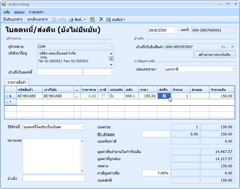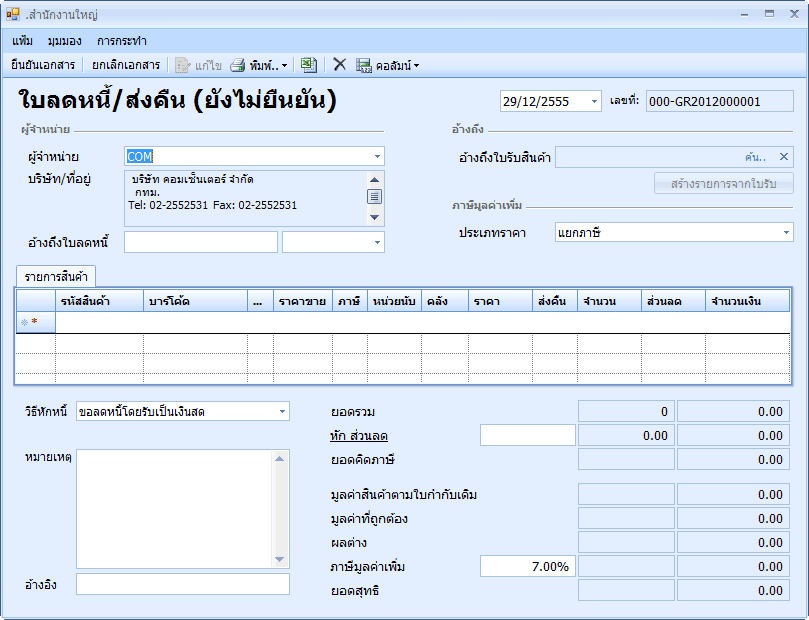 จากนั้น รายการสินค้าที่เลือกจะเข้ามาอยู่ในเอกสาร ให้คุณแก้ไขจำนวนและราคาตามมูลค่าที่ต้องการลดหนี้ต่อหน่วย