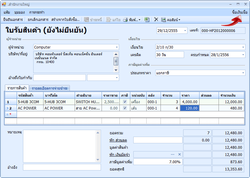 แสดงประเภทใบรับสินค้าเป็นซื้อเงินเชื่อ ที่มุมขวาบนของหน้าเอกสาร