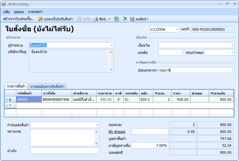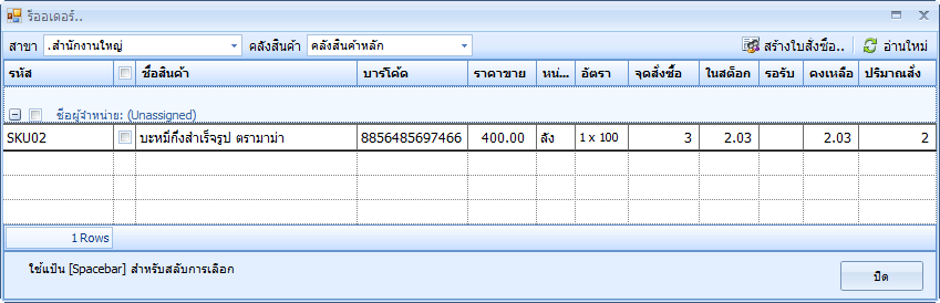 ให้คุณเช็คถูกเพื่อเลือกรายการที่จะนำไปสร้างในใบสั่งซื้อ จากนั้น คลิกที่ปุ่ม สร้างใบสั่งซื้อ โปรแกรมจะสร้างใบสั่งซื้อโดยมีรายการตามที่คุณเลือก