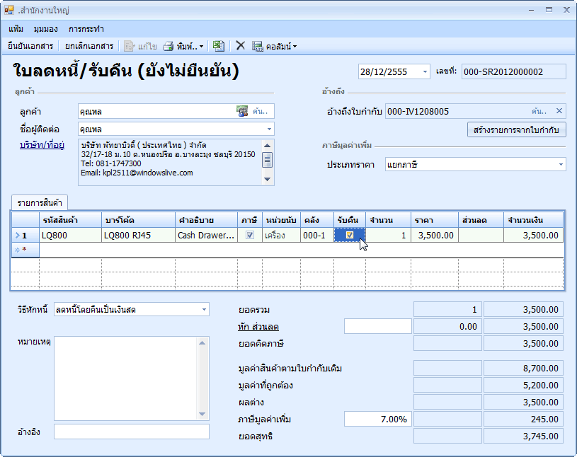 สำหรับวิธีที่ 1 นั้น โปรแกรมจะเปลี่ยนสถานะใบลดหนี้/รับคืนสินค้าเป็น ยังไม่ชำระ และใบลดหนี้/รับคืนสินค้าใบนี้จะไปปรากฏให้คุณเลือกได้ตอนทำใบเสร็จรับเงิน