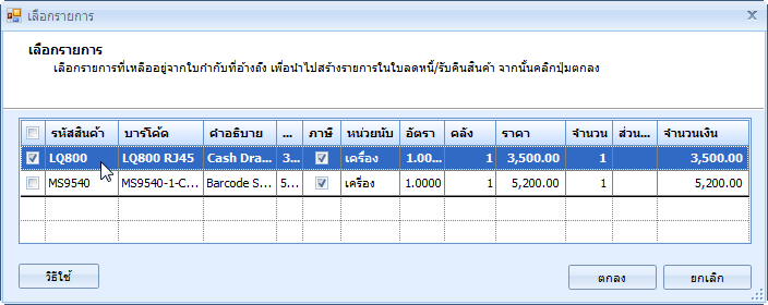 จะปรากฏหน้าต่างให้คุณเลือกรายการสินค้าตามใบกำกับที่อ้างถึง เพื่อนำมาทำลดหนี้ ให้คุณเช็คถูกหน้ารายการที่ต้องการเลือก