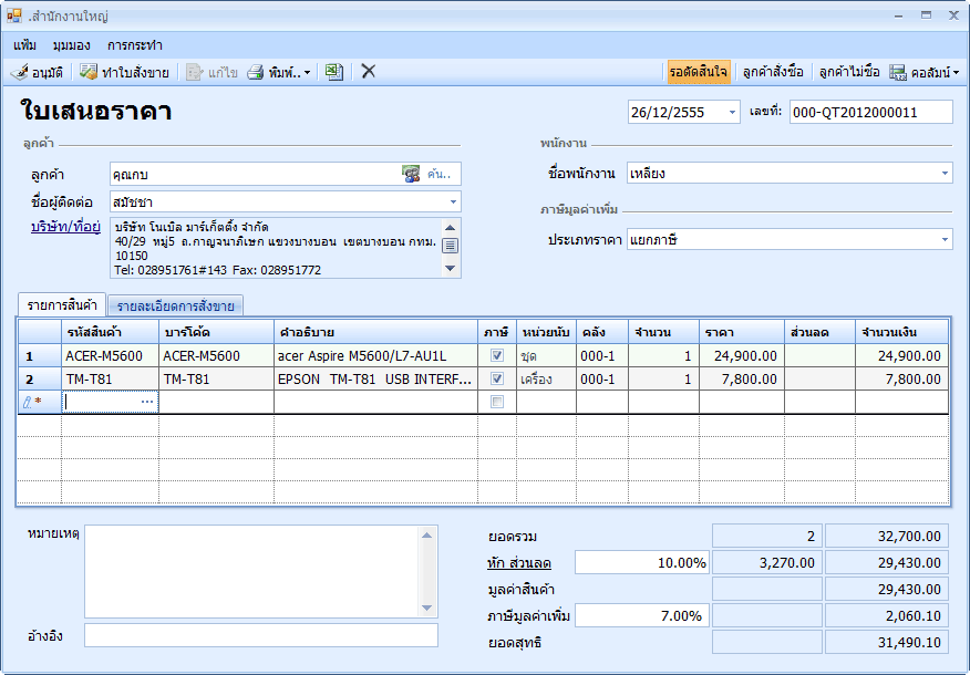 เพียงเท่านั้นพนักงานขายก็จะไม่สามารถพิมพ์ใบเสนอราคาออกทางเครื่องพิมพ์ได้หากใบเสนอราคานั้น ๆ ยังไม่ได้รับการอนุมัติ ฉะนั้นในขั้นตอนการทำงาน เมื่อพนักงานทำใบเสนอราคาเสร็จจะต้องแจ้งผู้จัดการทุกครั้ง ให้เข้าไปเปิดใบเสนอราคานั้น แล้ว คลิกปุ่มอนุมัติ ใบเสนอราคานั้นจึงจะพิมพ์ส่งให้ลูกค้าได้