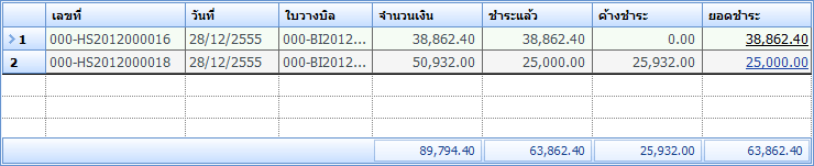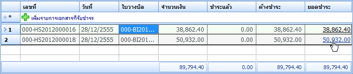 หากลูกค้าต้องการชำระเงินเพียงบางส่วน จากตัวอย่าง ใบกำกับเลขที่ 000-HS2012000018 ยอด 50,932.00 ลูกค้าต้องการชำระเพียง 25,000.00 ให้คุณคลิกที่ยอดชำระของใบกำกับตามภาพ