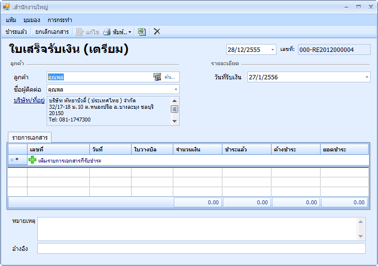 หลังจากเลือกลูกค้าแล้ว ให้ คลิกที่แถว เพิ่มรายการเอกสารที่รับชำระ