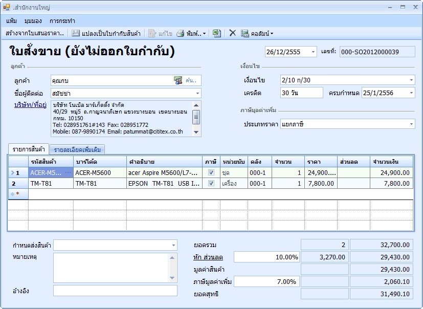 หลังจากเลือกใบเสนอราคาที่ต้องการนำมาสร้างแล้ว รายการในใบเสนอราคาที่เลือกนั้นจะเข้ามาอยู่ในใบสั่งขาย