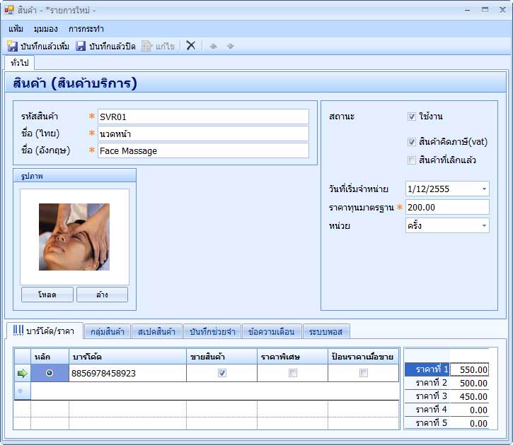 สินค้าบริการ เป็นสินค้าประเภทที่ไม่สต็อก มีหน่วยนับเริ่มต้นเป็น “ครั้ง” ไม่สามารถทำซื้อหรือรับเข้าสต็อกได้