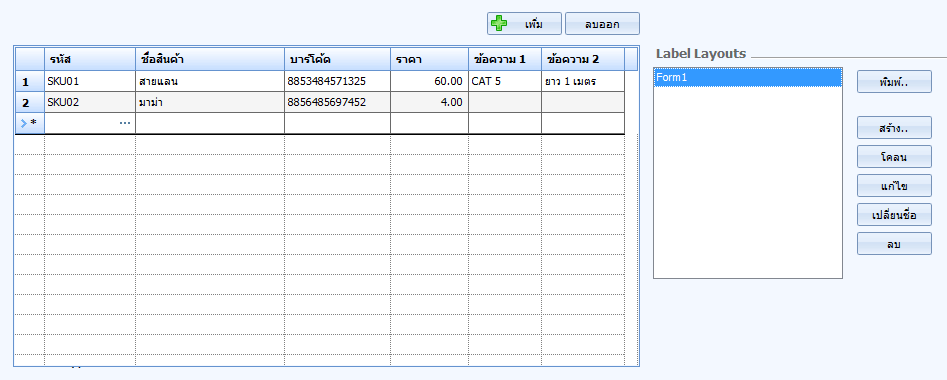 ทุกคอลัมน์สามารถแก้ไขได้อย่างอิสระ ข้อความ 1 และ 2 เป็นข้อความเพิ่มเติมที่จะพิมพ์ลงบนป้ายราคา
