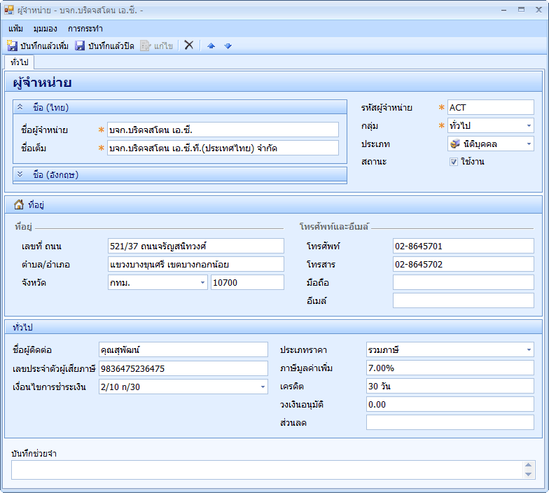 เลขประจำตัวผู้เสียภาษี ประเภทราคา ภาษีมูลค่าเพิ่ม เครดิต เงื่อนไขการชำระเงิน และวงเงินอนุมัติ