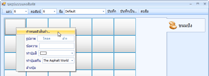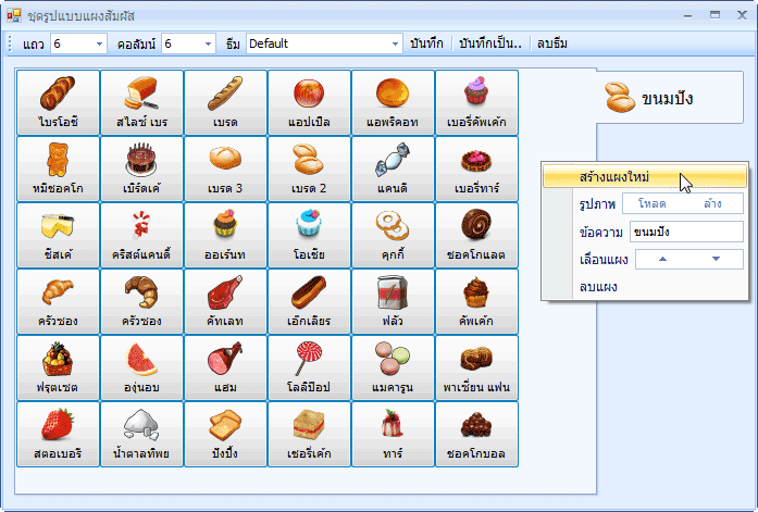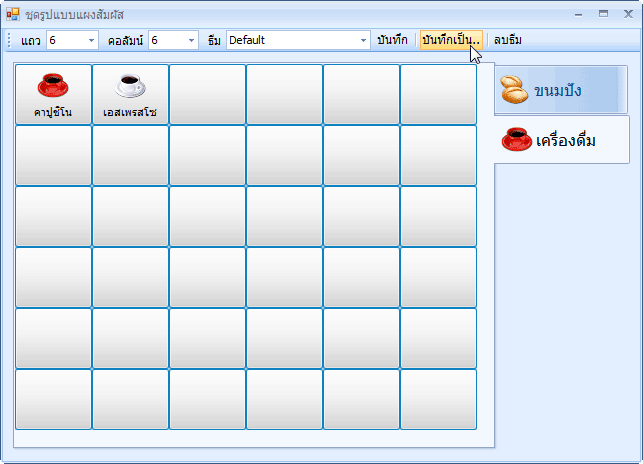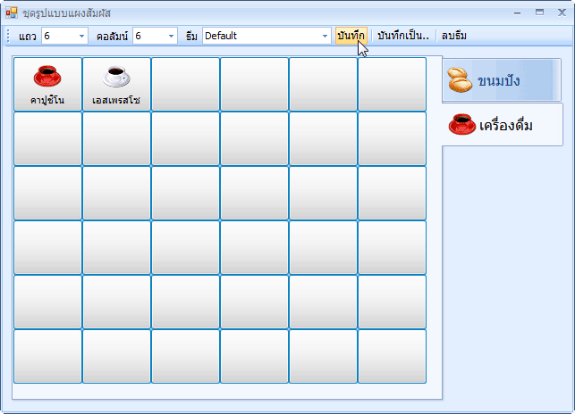 จากภาพตัวอย่าง มี 2 แผง คือ ขนมปัง และ เครื่องดื่ม ในแต่ละแผงประกอบด้วยปุ่มสัมผัสตามจำนวนแถวและคอลัมน์ที่กำหนดบนแถบเครื่องมือ
